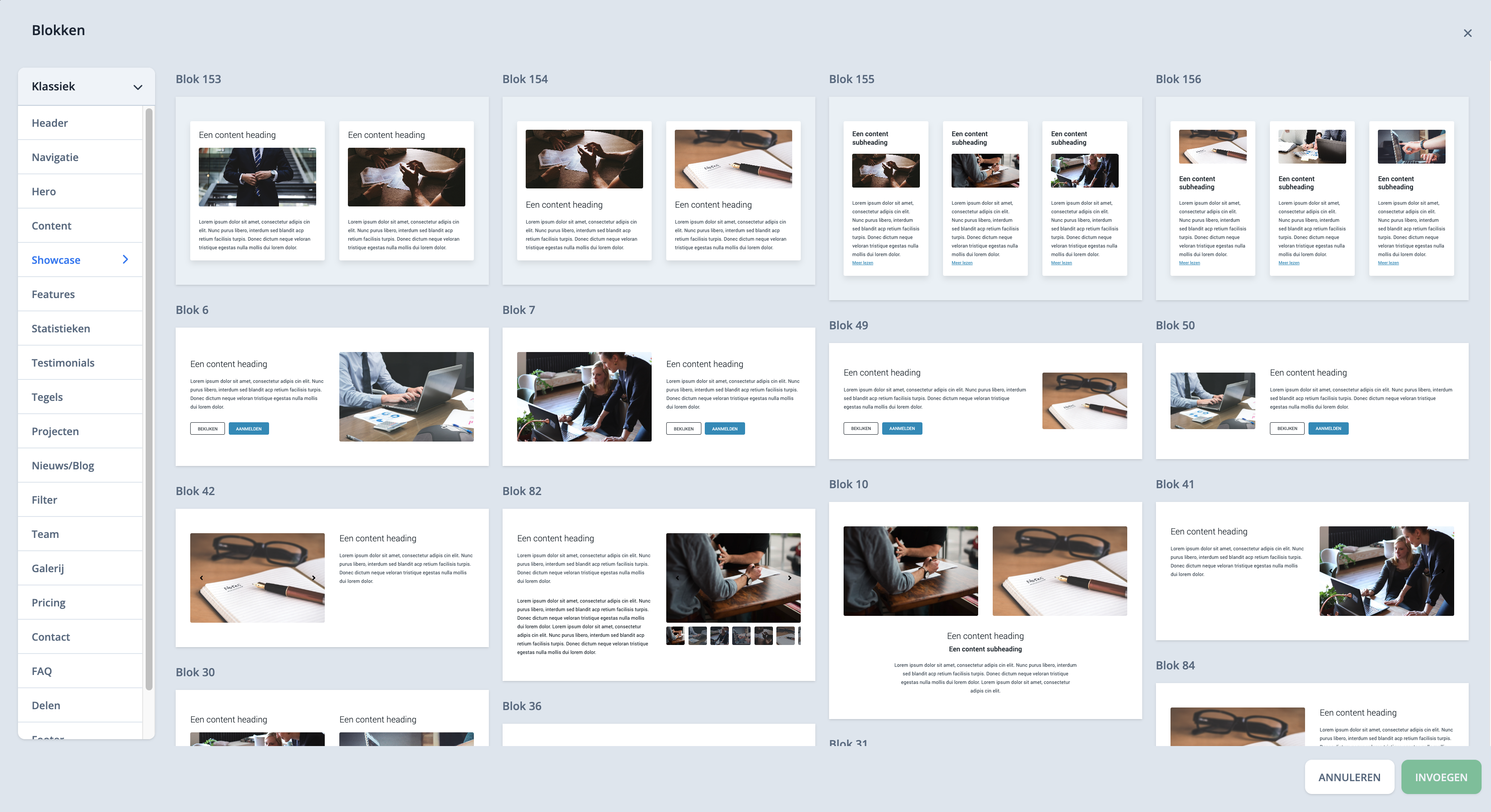 Je kan kiezen voor verschillende categorieën en per categorie kun je de bijhorende blokken bekijken. Dubbel-klik op een blok om deze op de pagina te plaatsen.