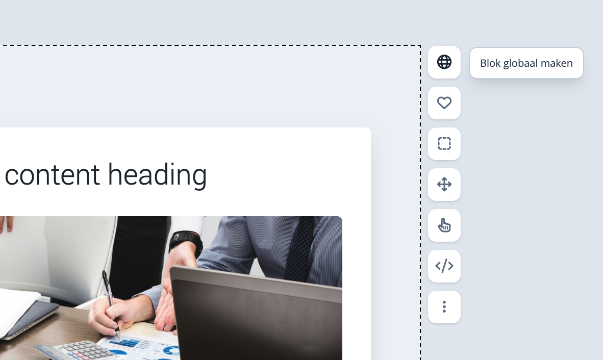 Wanneer een blok globaal gemaakt is dan verschijnt het betreffende blok in de categorie "globaal" in de linkerkantlijn. Vanuit deze categorie kan het globale blok op iedere pagina geplaatst worden.