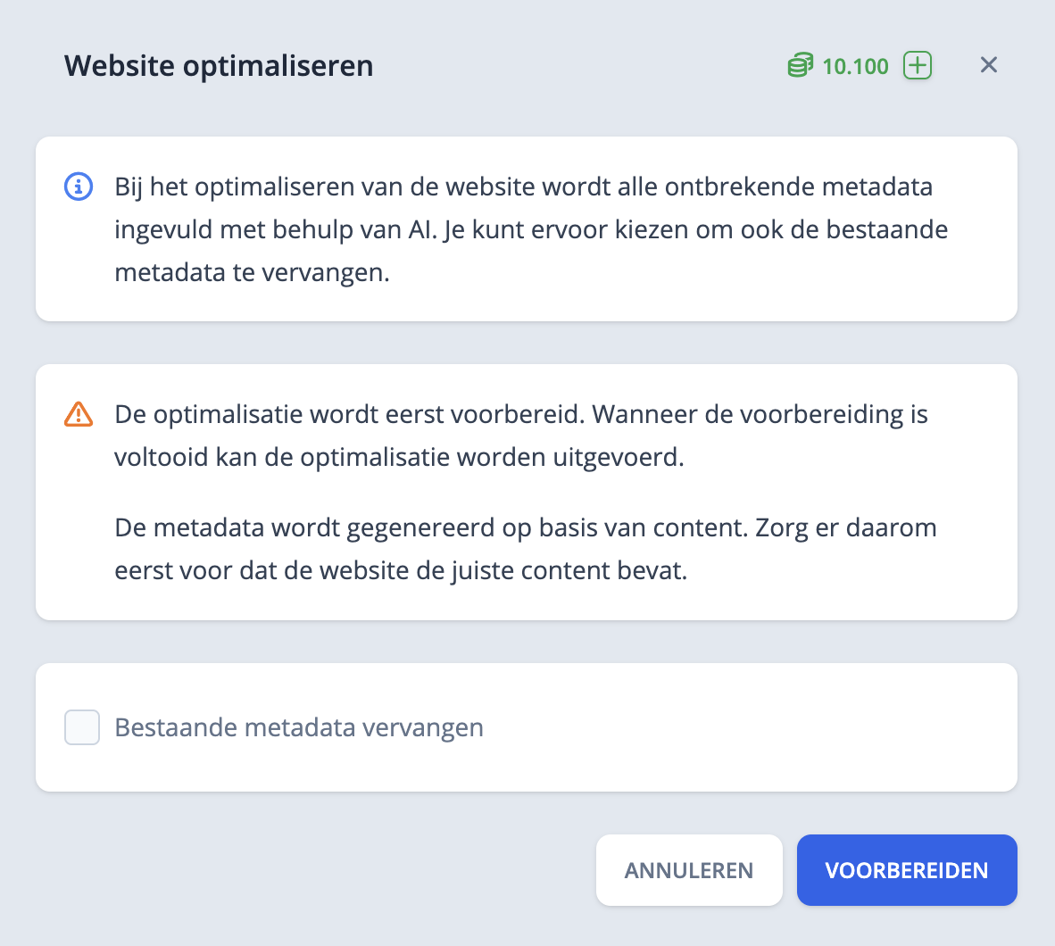 Het optimalisatie proces bestaat uit twee delen, namelijk: "Voorbereiden" en "Uitvoeren". Tijdens de eerste fase, voorbereiden, gaat het systeem de content van de pagina ophalen en deze aanbieden aan de AI met als opdracht om er een meta-titel en meta-omschrijving bij te schrijven. Dit wordt gedaan voor alle pagina's. Wanneer de eerste fase afgerond is, kun je de meta-titels en meta-omschrijvingen bekijken. Je kan dan beslissen of je deze wel/niet doorvoert op de website.