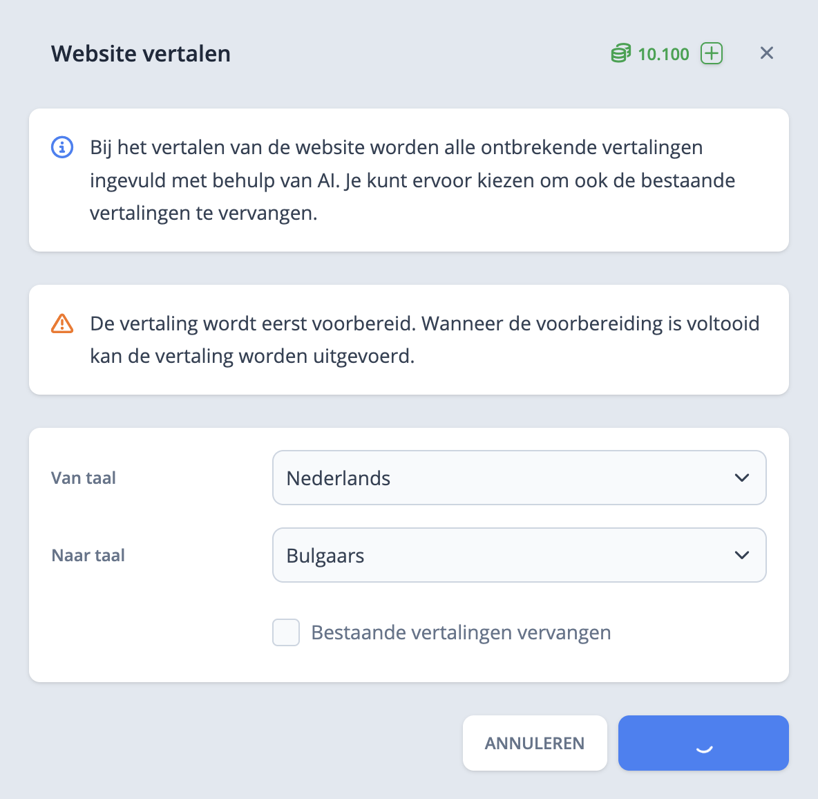 Met de bulkactie "website vertalen" kun je in één keer een hele website vertalen. Dit proces verloopt in twee fases: voorbereiden en uitvoeren. Tijdens de voorbereidingsfase worden alle vertalingen gedaan door gebruik te maken van AI technologie. De vertalingen van meta-titels en meta-omschrijvingen kunnen per pagina bekeken worden. De vertalingen van de pagina's zelf kun je niet previewen. Het is dus aan te raden om voor het vertalen een backup te maken van de site zodat je deze eenvoudig weer kunt terugzetten als zaken niet naar wens zijn. Backups kun je maken in het overzicht van de website onder tabblad "backup".