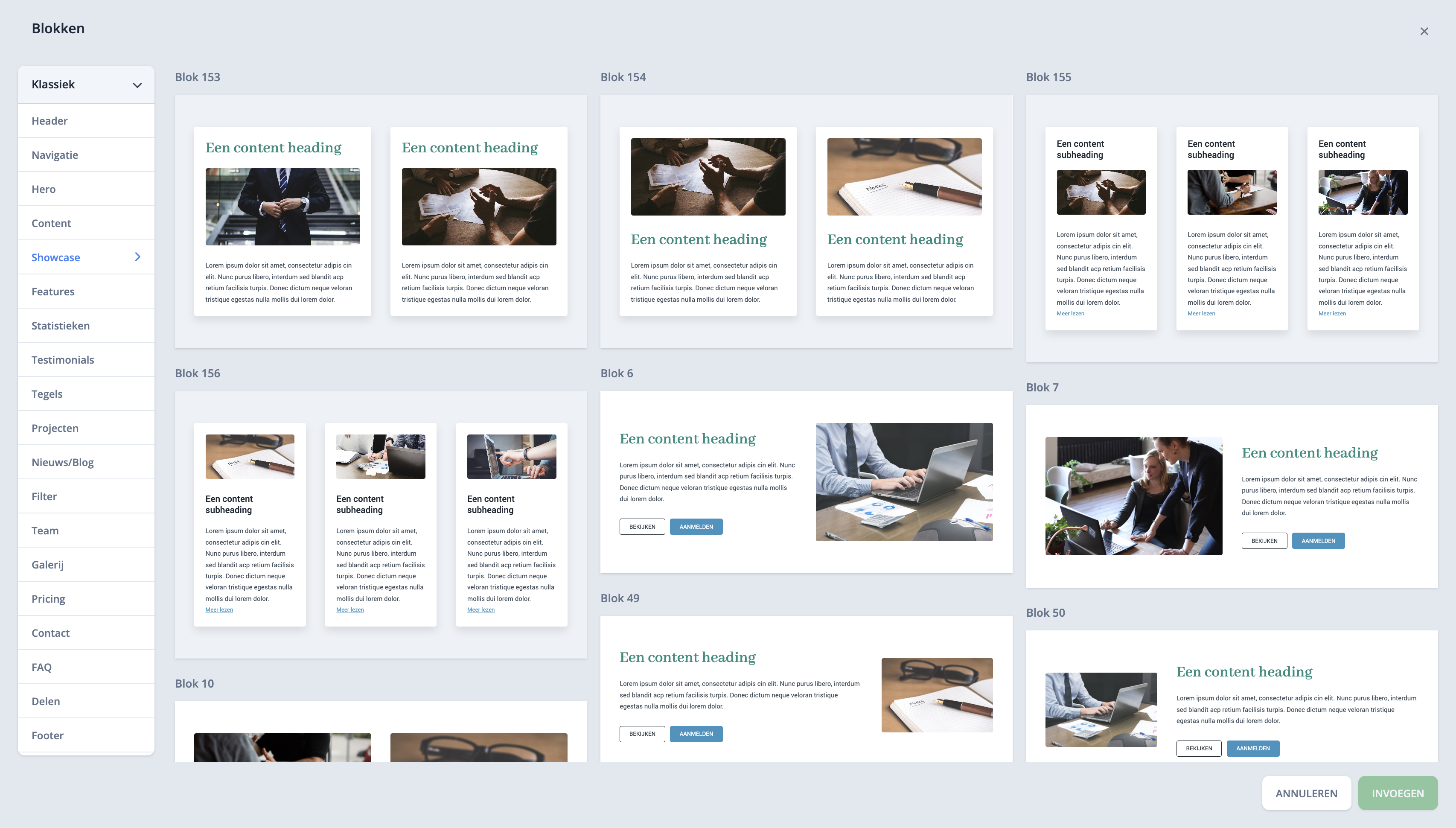 Phytalis bevat een groot collectie met kant-en-klare blokken. Bouwen met blokken is de meest efficiente manier om websites te bouwen. Door gebruik te maken van kant-en-klare blokken kun je snel websites bouwen. Je hebt daarbij de zekerheid dat de verschillende blokken perfect werken op de diverse devices.