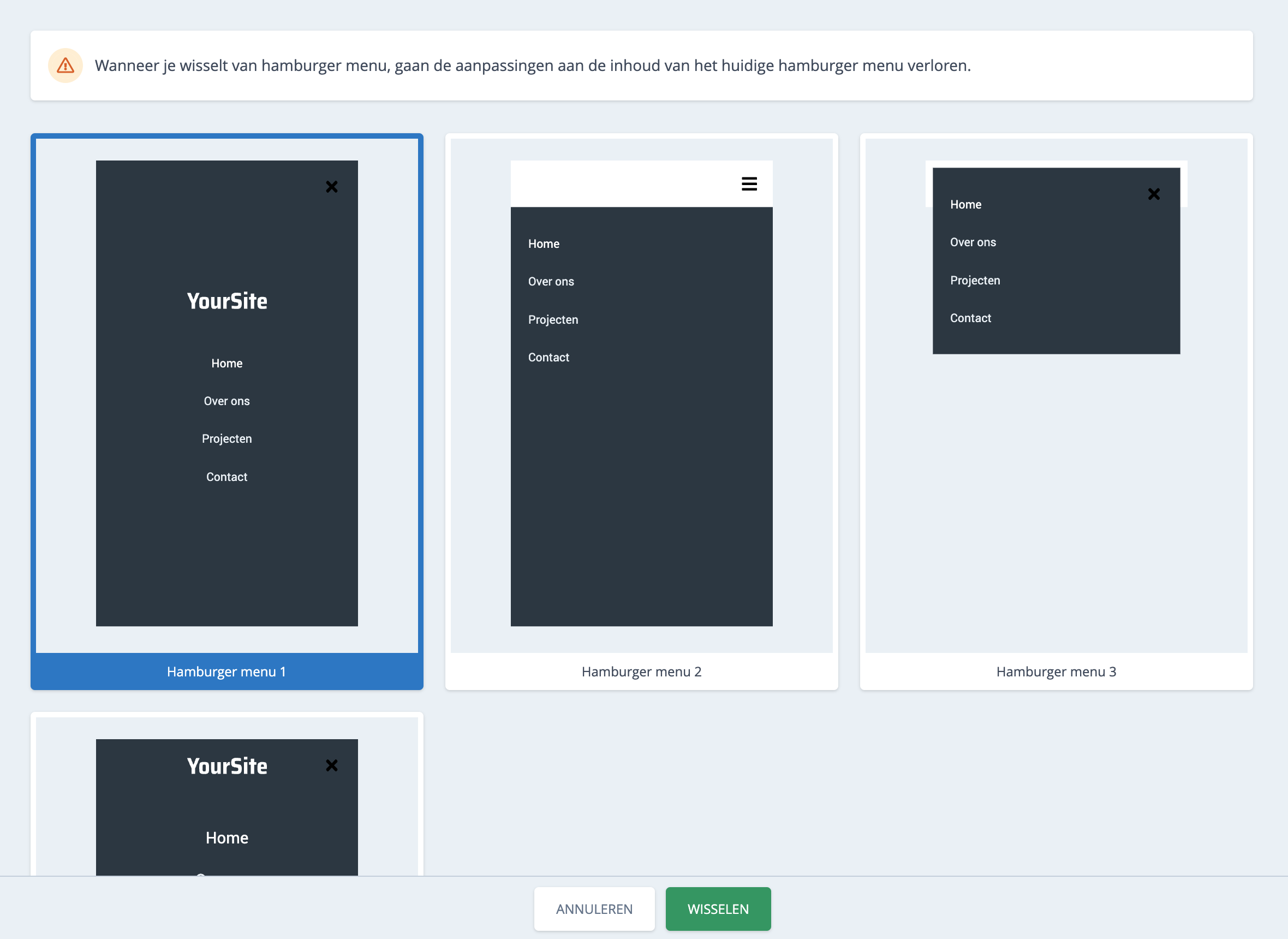 Er verschijnt een popin met daarin de diverse beschikbare mobielemenutypes. Selecteer het gewenste type. Er zijn vier soorten mobielemenu's waaruit je kan kiezen.